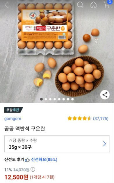 삶은 계란과의 가격 비교를 위해 동일하게 쿠팡의 자체 브랜드인 곰곰 구운란 30구 기준 가격을 찾아보았습니다. 30구에 12,500원으로 삶은 계란보다 약3,000원 정도 저렴하였습니다.