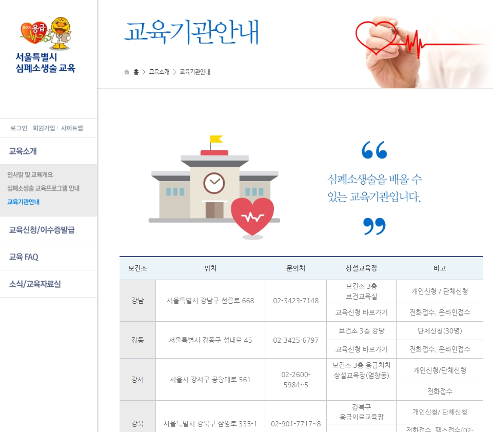 서울시 응급의료지원단에서 진행하는 심폐소생술 교육기관입니다. 각 지자체별로 운영 중인 보건소뿐만 아니라 서울시민 안천 체험관, 응급의료 교육장, 생명안전 배움터 등 다양한 기관에서 시행 중인 교육을 신청할 수 있습니다.